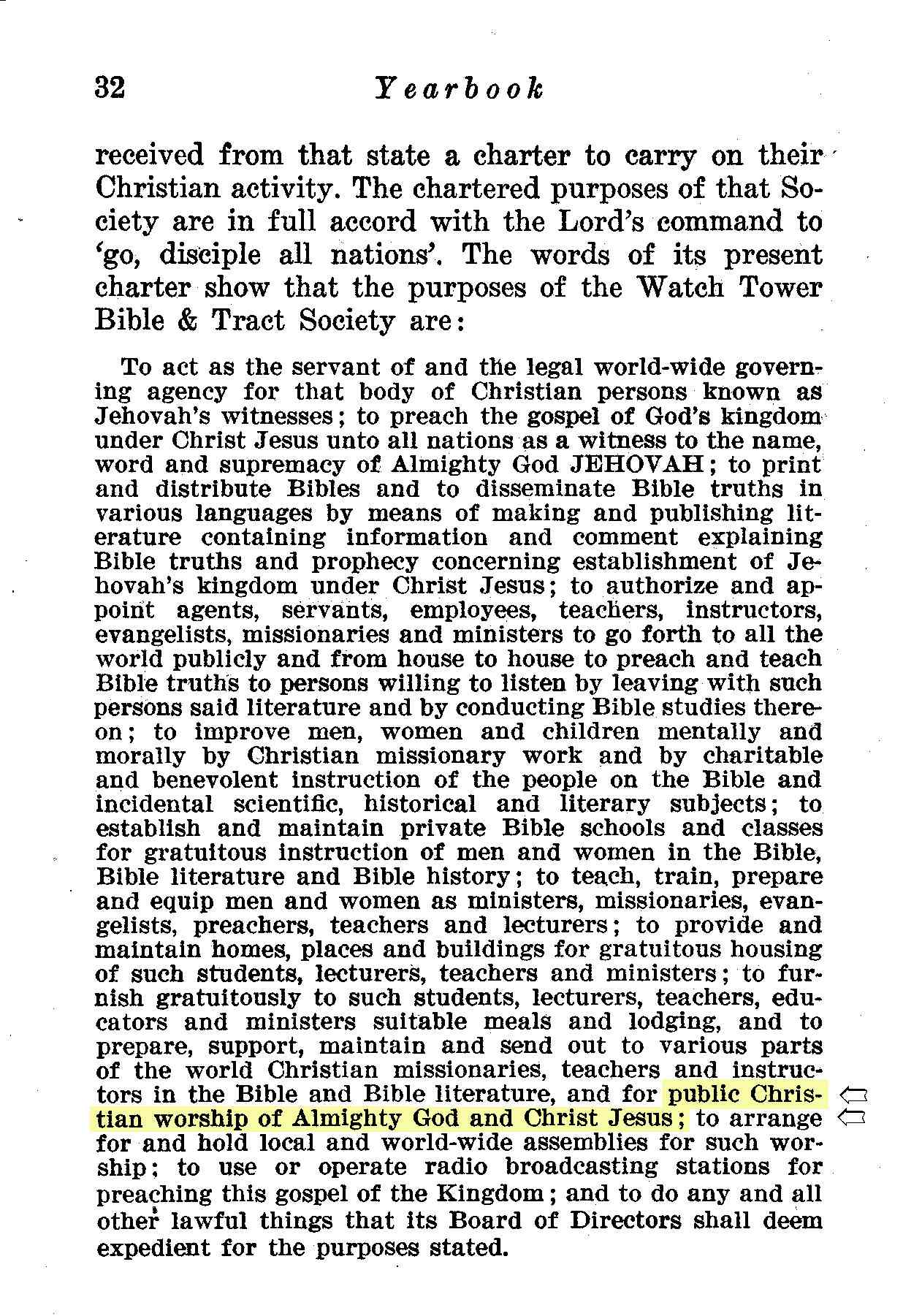 Below is a photocopy from page 32 of this book where a portion of their charter is stated. It starts out saying the "purposes of the Watch Tower Bible & Tract Society are:" and the following list leads to the significant line (marked below) where they claim the "worship of Almighty God and Christ Jesus". Note that this group believed then, as it does now, that "Christ Jesus" is another name for the archangel Michael.